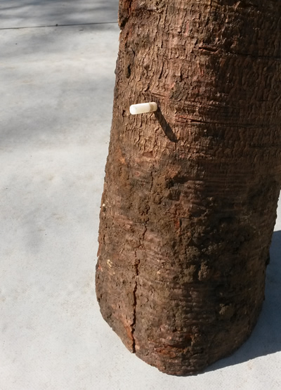 Voor de houten pen moet je een gat van 16 mm in de boom boren, ca. 5 cm diep. De pen lijm je in het gat .